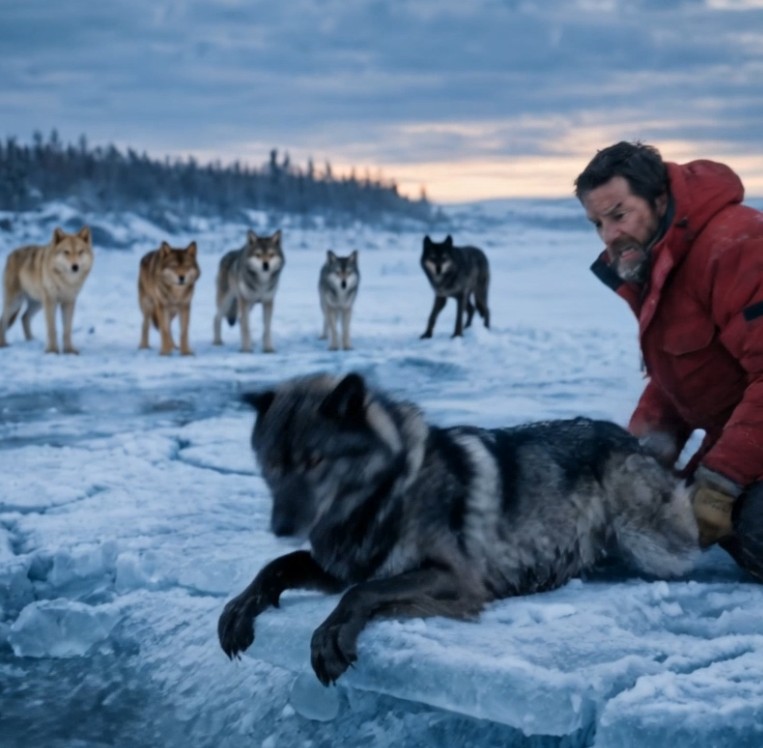 Bir adam, buz gibi suda boğulmak üzere olan hamile bir dişi kurdu kurtardı